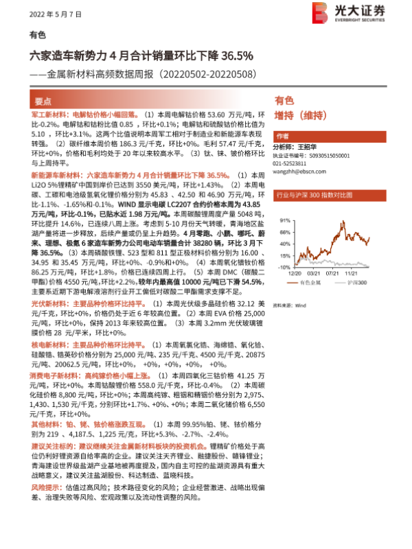 【光大证券】【20220507】20220507-光大证券-金属新材料高频数据周报:六家造车新势力4月合计销量环比下降36.5%-26页