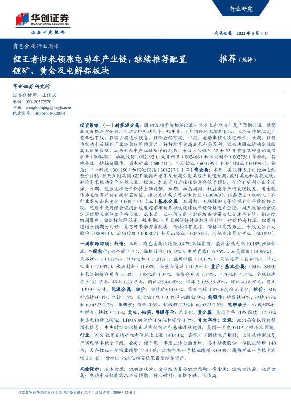 【华创证券】【20220501】20220501-华创证券-有色金属行业周报:锂王者归来领涨电动车产业链,继续推荐配置锂矿、黄金及电解铝板块-31页