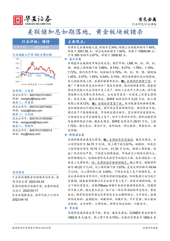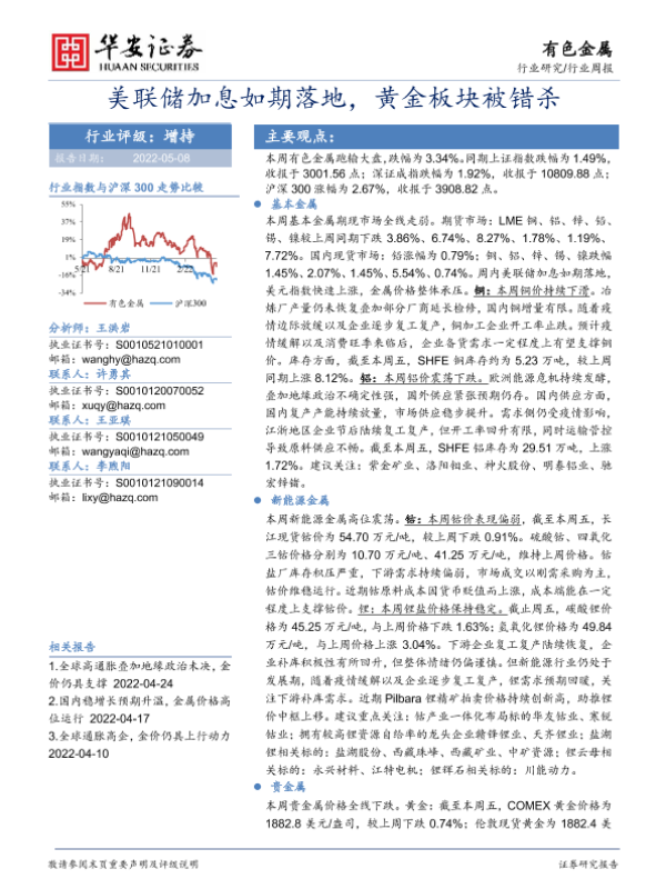 【华安证券】【20220508】20220508-华安证券-有色金属行业周报:美联储加息如期落地,黄金板块被错杀-16页