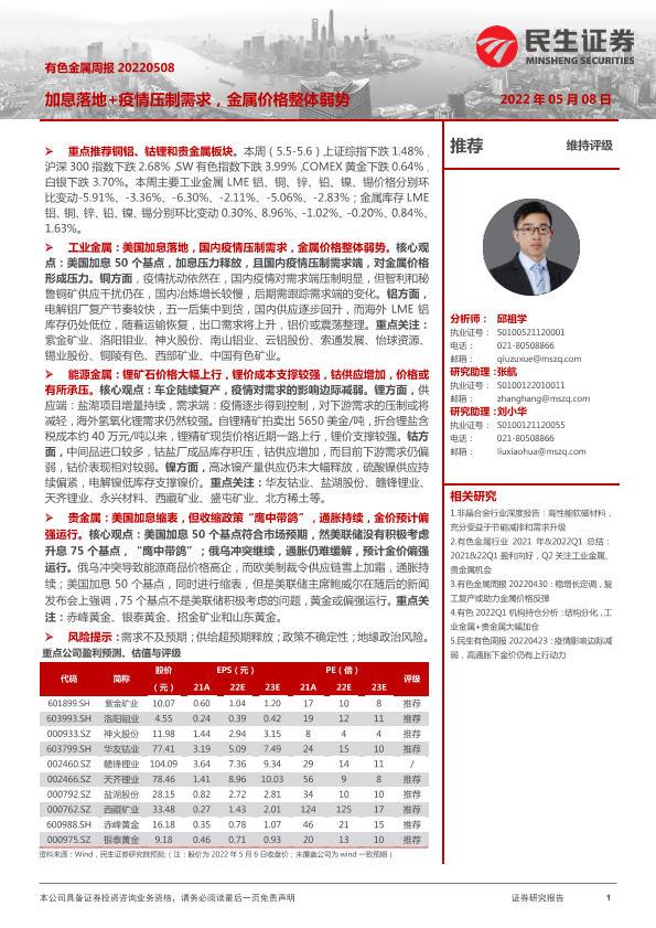 【民生证券】【20220508】20220508-民生证券-有色金属周报:加息落地+疫情压制需求,金属价格整体弱势-25页