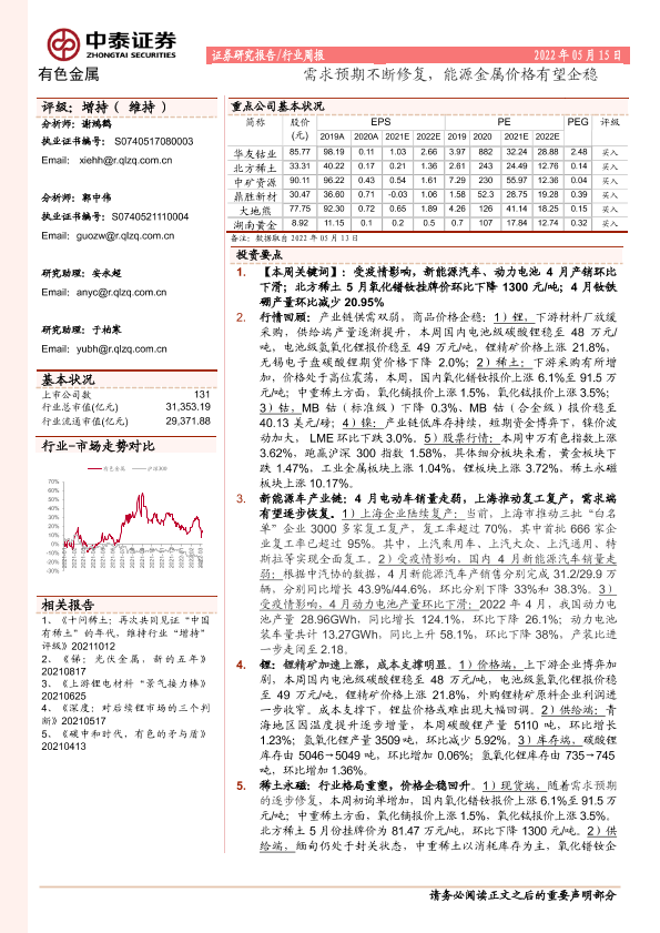 【中泰证券】【20220515】20220515-中泰证券-有色金属行业周报:需求预期不断修复,能源金属价格有望企稳-25页