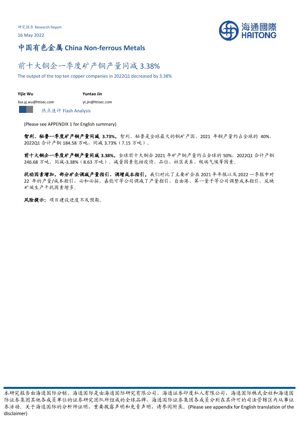 【海通国际】【20220516】中国有色金属:前十大铜企一季度矿产铜产量同减3.38%-13页