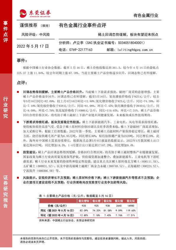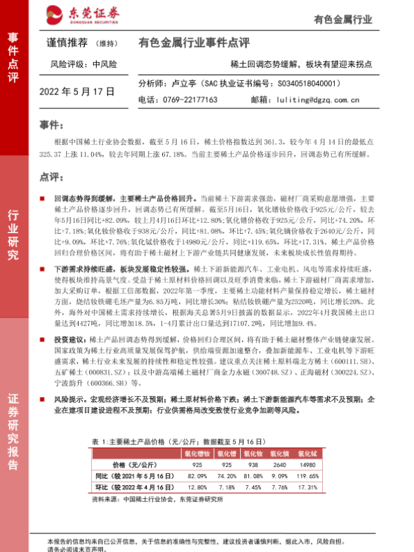 【东莞证券】【20220517】20220517-东莞证券-有色金属行业事件点评:稀土回调态势缓解,板块有望迎来拐点-3页