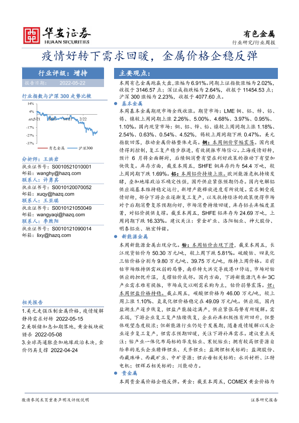 【华安证券】【20220522】20220522-华安证券-有色金属行业周报:疫情好转下需求回暖,金属价格企稳反弹-16页