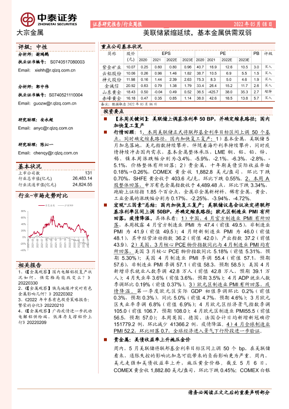【中泰证券】【20220508】20220508-中泰证券-大宗金属行业周报:美联储紧缩延续,基本金属供需双弱-28页