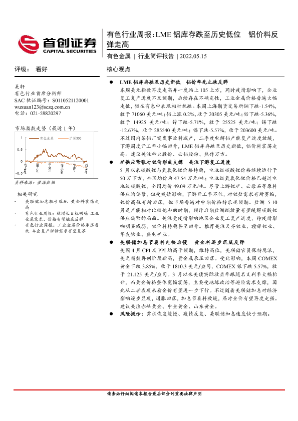 【首创证券】【20220515】20220515-首创证券-有色行业周报:LME铝库存跌至历史低位 铝价料反弹走高-21页