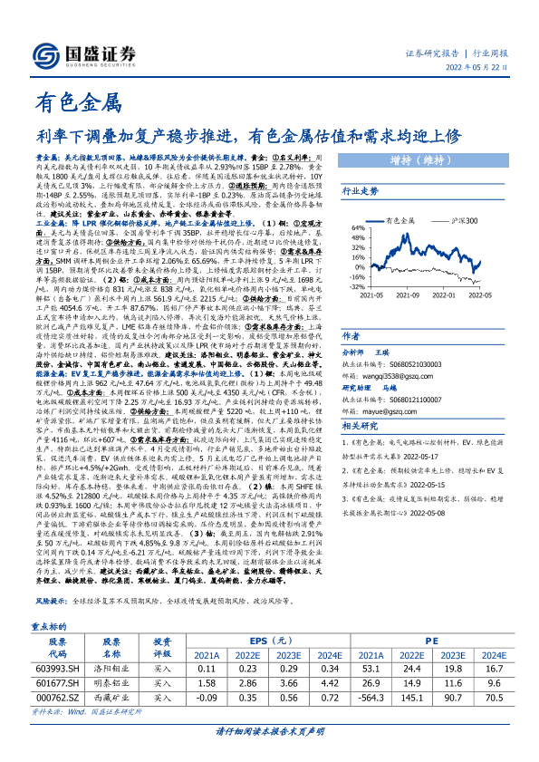 【国盛证券】【20220522】20220522-国盛证券-有色金属行业周报:利率下调叠加复产稳步推进,有色金属估值和需求均迎上修-20页