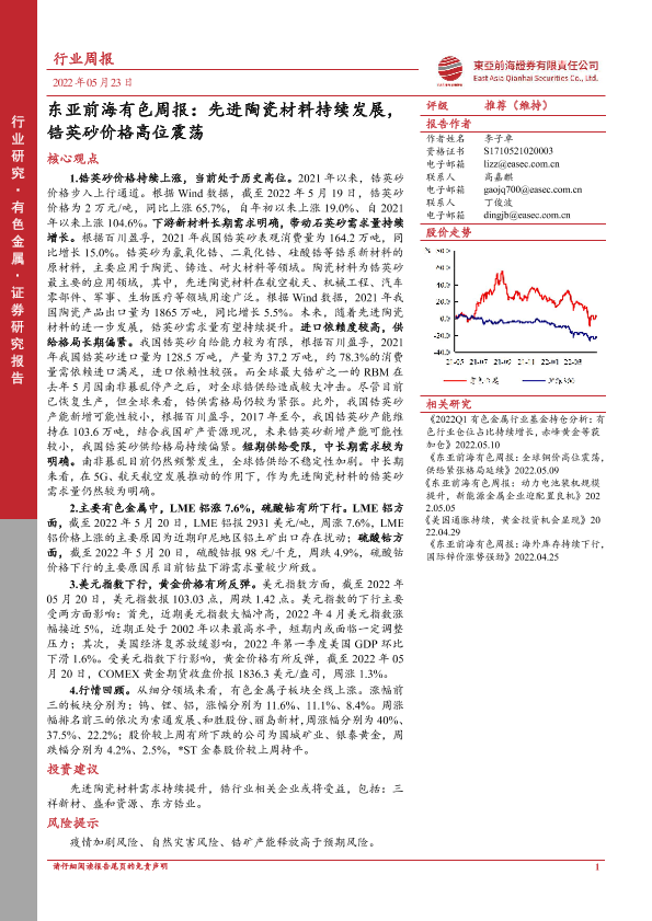 【东亚前海证券】【20220523】东亚前海有色周报:先进陶瓷材料持续发展,锆英砂价格高位震荡-21页