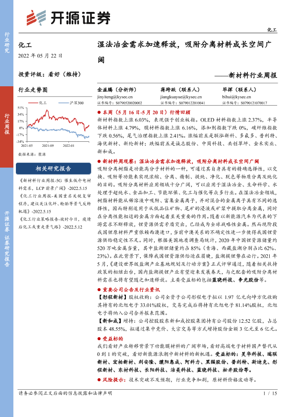 【开源证券】【20220522】20220522-开源证券-新材料行业周报:湿法冶金需求加速释放,吸附分离材料成长空间广阔-15页