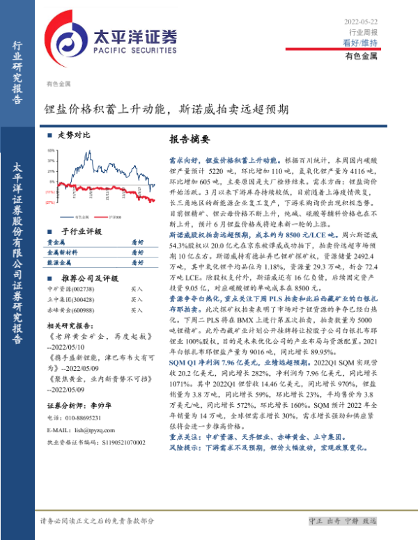 【太平洋证券】【20220522】20220522-太平洋-有色金属行业周报:锂盐价格积蓄上升动能,斯诺威拍卖远超预期-14页
