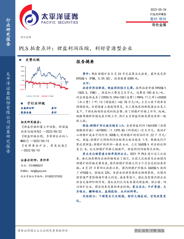 【太平洋证券】【20220524】有色金属:PLS拍卖点评:锂盐利润压缩,利好资源型企业-3页