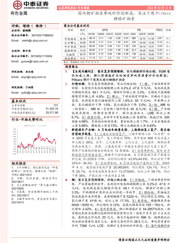 【中泰证券】【20220522】20220522-中泰证券-有色金属行业周报:国内锂矿拍卖单吨对价创新高,关注下周Pilbara锂精矿拍卖-26页