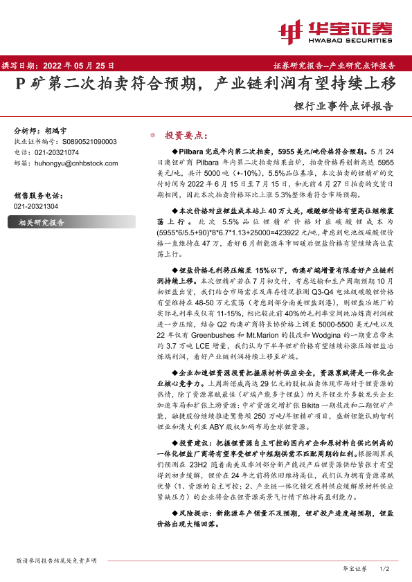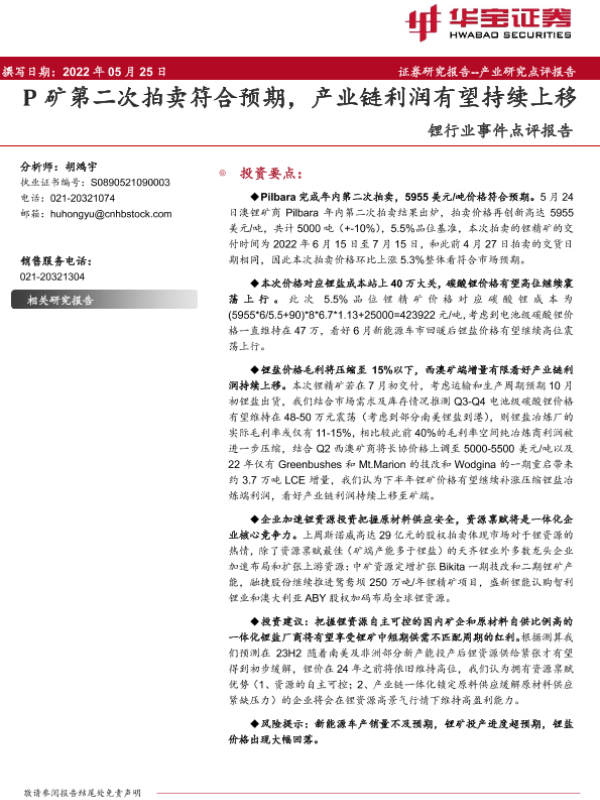 【华宝证券】【20220525】20220525-华宝证券-锂行业事件点评报告:P矿第二次拍卖符合预期,产业链利润有望持续上移-2页