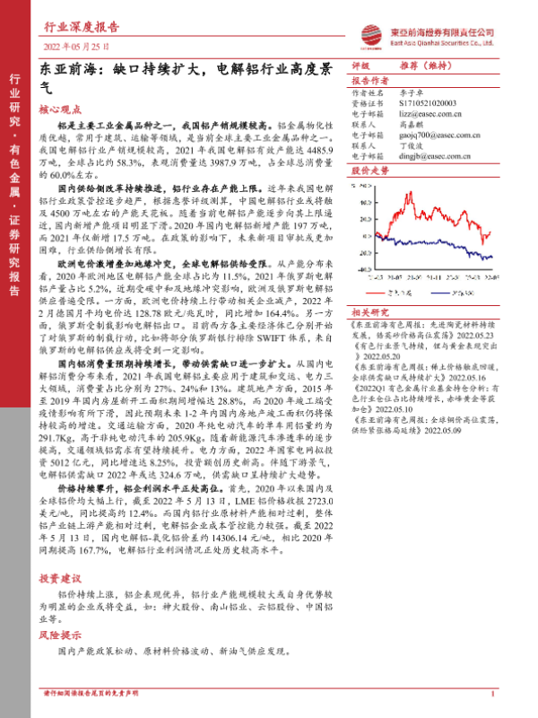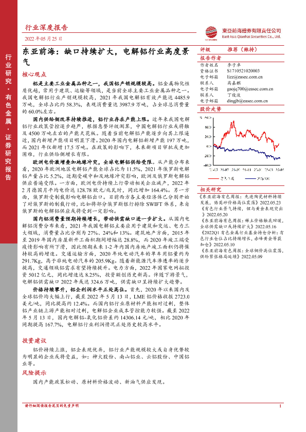 【东亚前海证券】【20220525】20220525-东亚前海证券-有色金属行业深度报告:缺口持续扩大,电解铝行业高度景气-40页