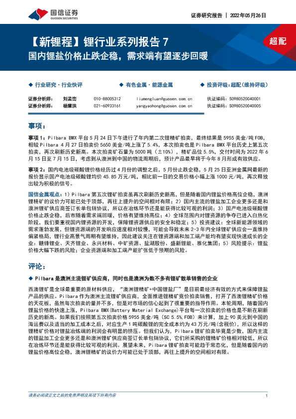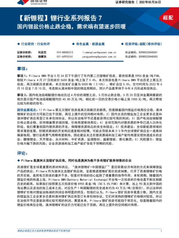 【国信证券】【20220526】【新锂程】锂行业系列报告7:国内锂盐价格止跌企稳,需求端有望逐步回暖-10页
