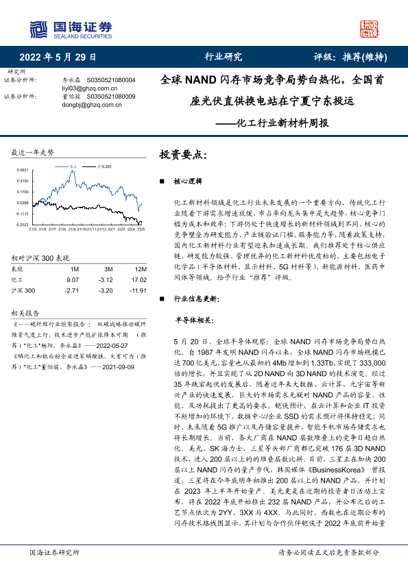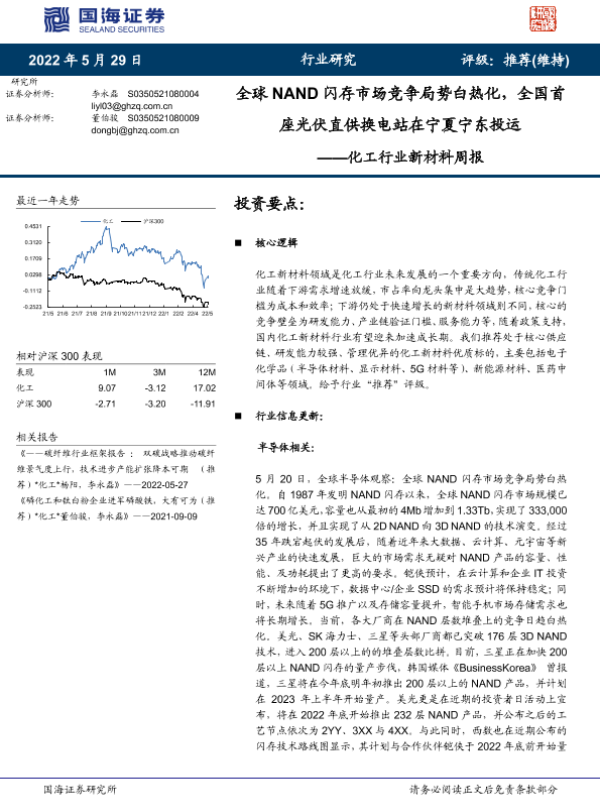 【国海证券】【20220529】20220529-国海证券-化工行业新材料周报:全球NAND闪存市场竞争局势白热化,全国首座光伏直供换电站在宁夏宁东投运-41页