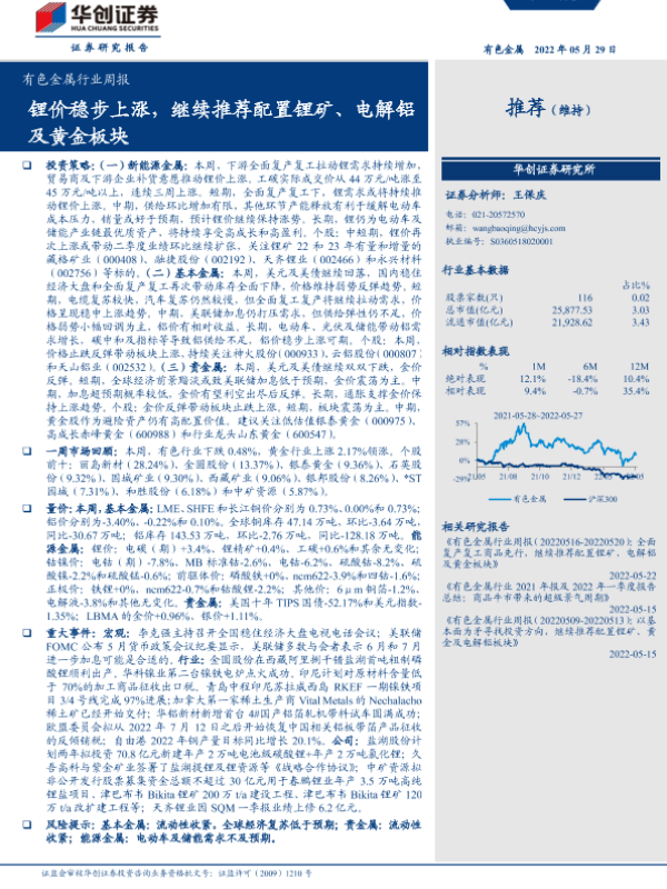 【华创证券】【20220529】20220529-华创证券-有色金属行业周报:锂价稳步上涨,继续推荐配置锂矿、电解铝及黄金板块-20页