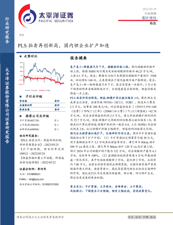 【太平洋证券】【20220529】20220529-太平洋-有色行业周报:PLS拍卖再创新高,国内锂企业扩产加速-14页