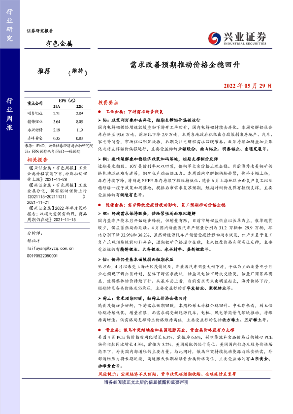 【兴业证券】【20220529】20220529-兴业证券-有色金属行业周报:需求改善预期推动价格企稳回升-19页