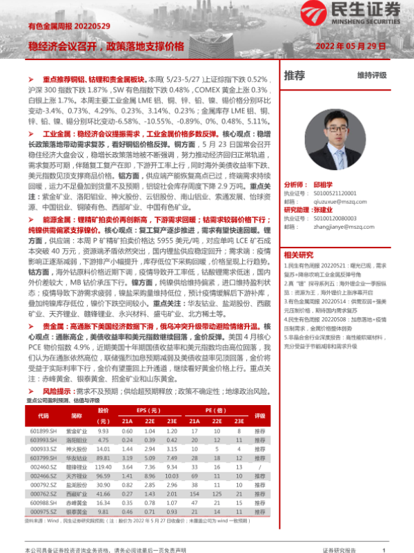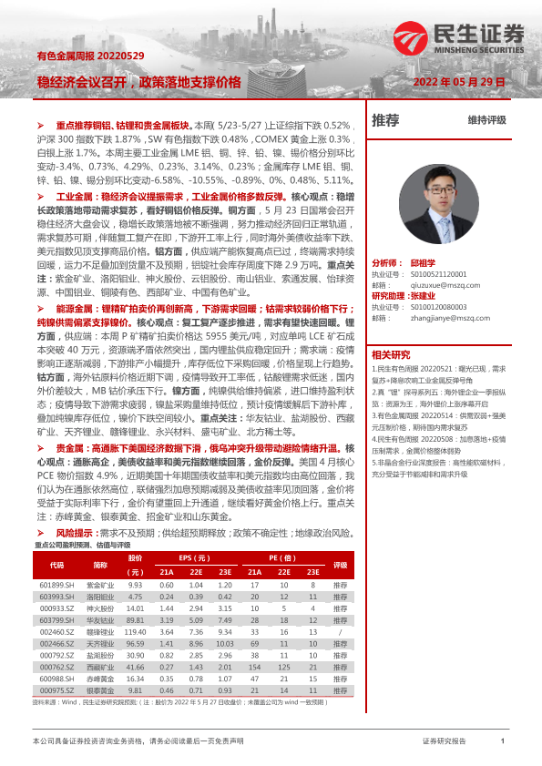 【民生证券】【20220529】20220529-民生证券-有色金属周报:稳经济会议召开,政策落地支撑价格-30页