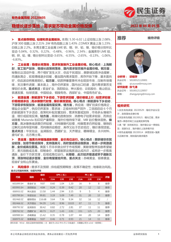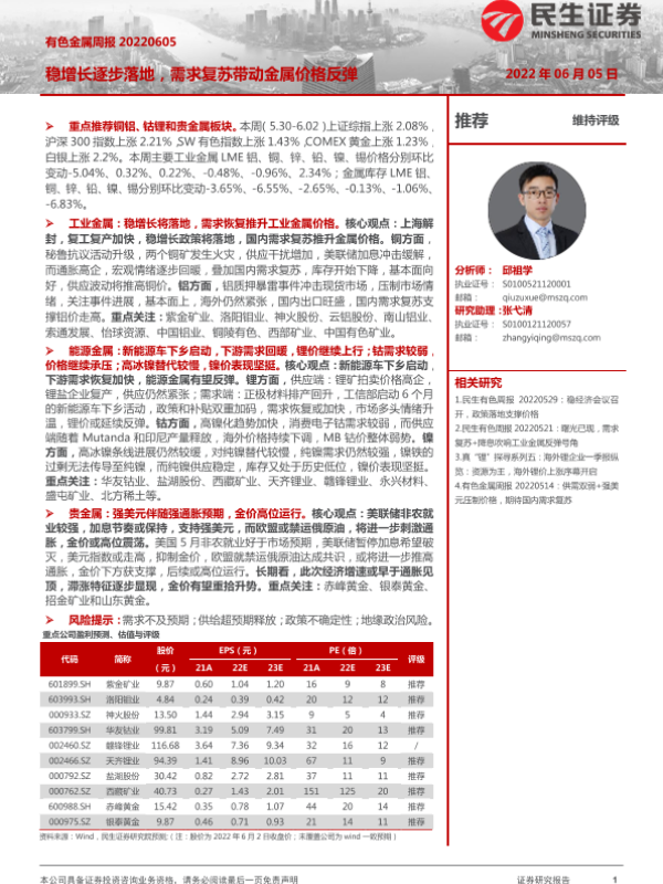 【民生证券】【20220605】20220605-民生证券-有色金属周报:稳增长逐步落地,需求复苏带动金属价格反弹-26页