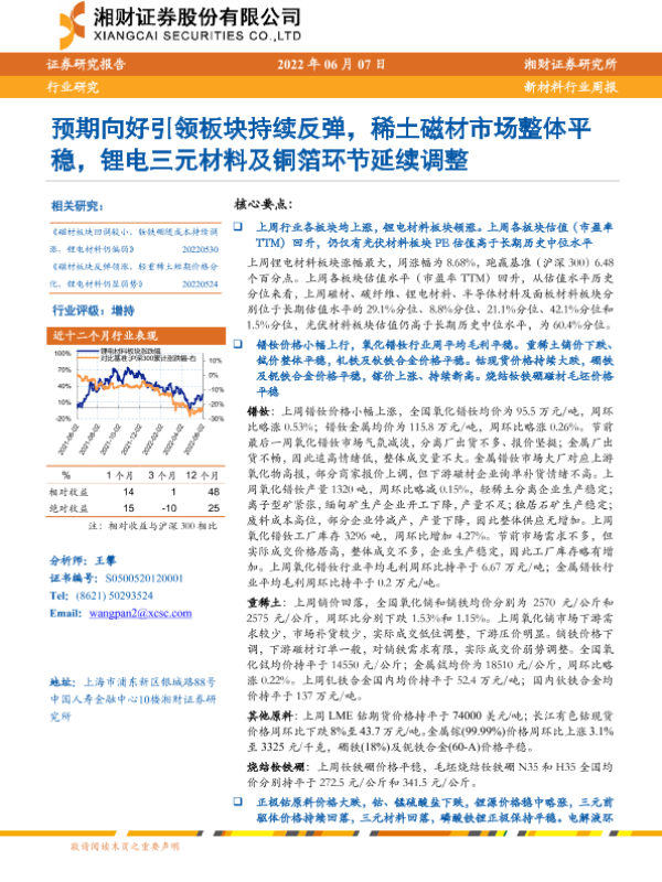【湘财证券】【20220607】20220607-湘财证券-新材料行业周报:预期向好引领板块持续反弹,稀土磁材市场整体平稳,锂电三元材料及铜箔环节延续调整-17页