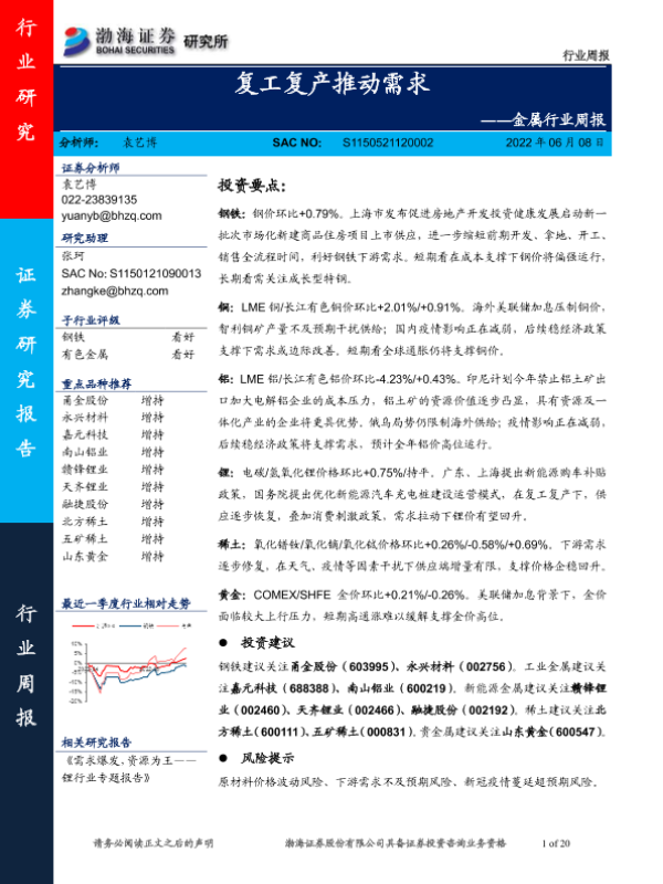 【渤海证券】【20220608】金属行业周报:复工复产推动需求-20页