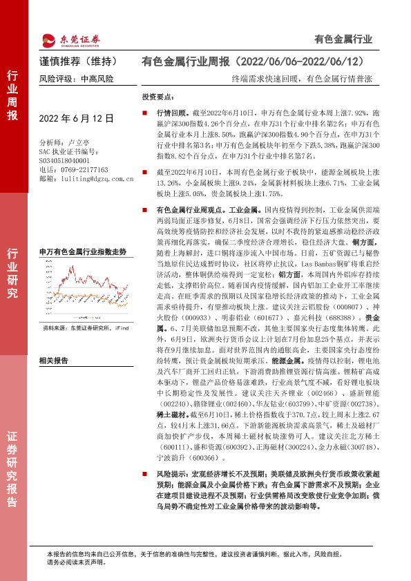 【东莞证券】【20220612】20220612-东莞证券-有色金属行业周报:终端需求快速回暖,有色金属行情普涨-10页