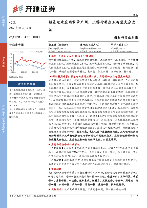 【开源证券】【20220612】20220612-开源证券-新材料行业周报:锰基电池应用前景广阔,上游材料企业有望充分受益-15页
