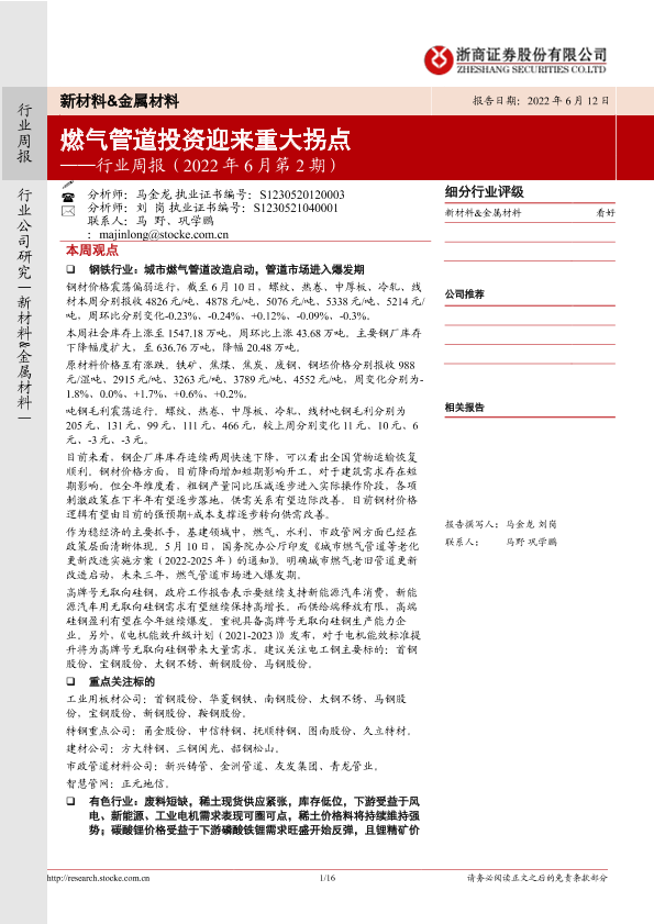 【浙商证券】【20220612】20220612-浙商证券-新材料&金属材料行业周报(2022年6月第2期):燃气管道投资迎来重大拐点-16页