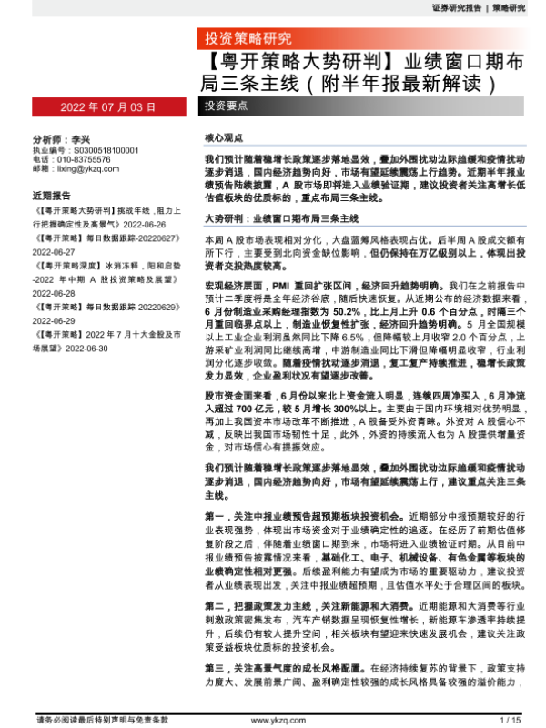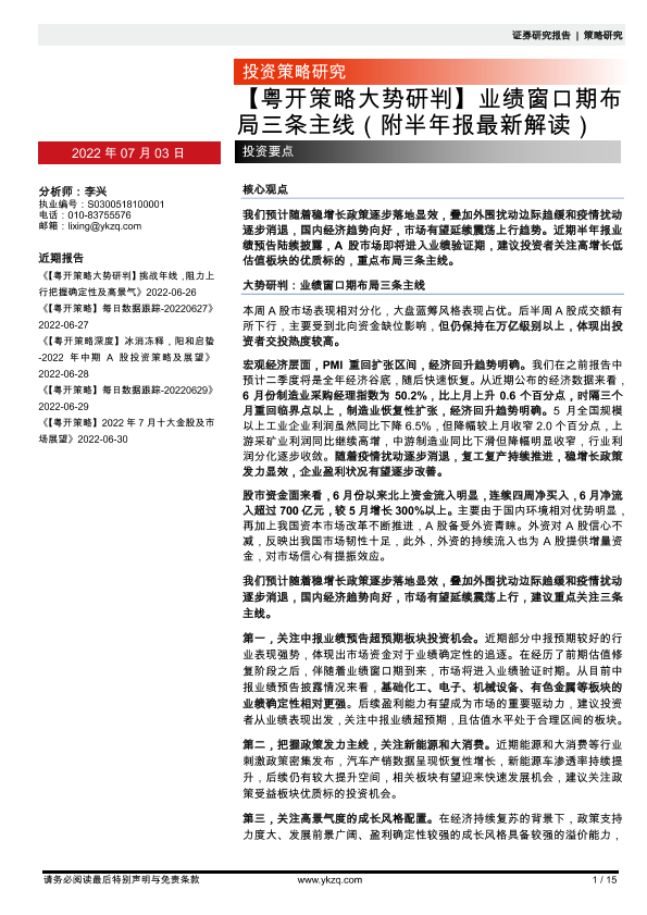 【粤开证券】【20220703】【粤开策略大势研判】业绩窗口期布局三条主线(附半年报最新解读)-15页