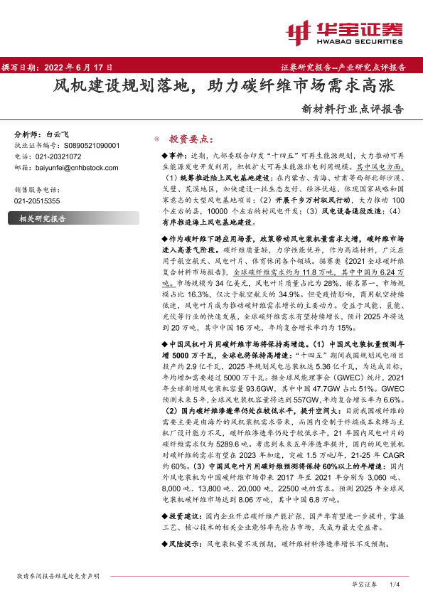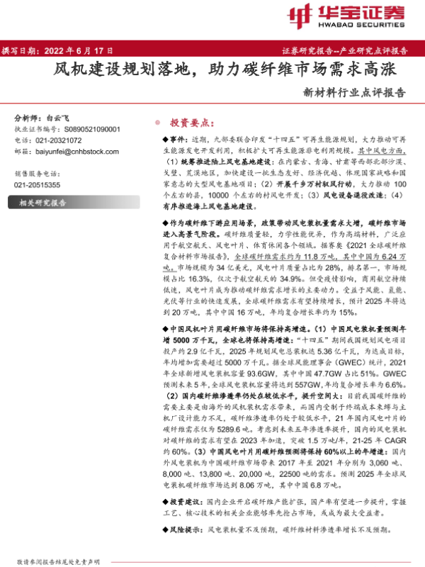 【华宝证券】【20220617】20220617-华宝证券-新材料行业点评报告:风机建设规划落地,助力碳纤维市场需求高涨-4页