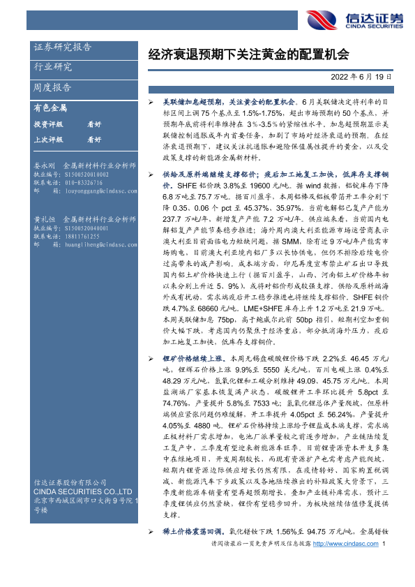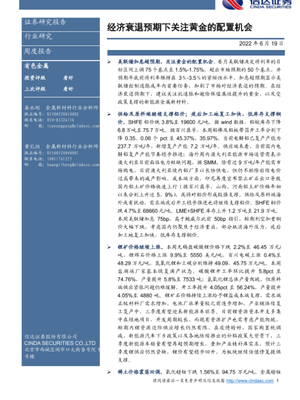 【信达证券】【20220619】20220619-信达证券-有色金属行业周度报告:经济衰退预期下关注黄金的配置机会-11页