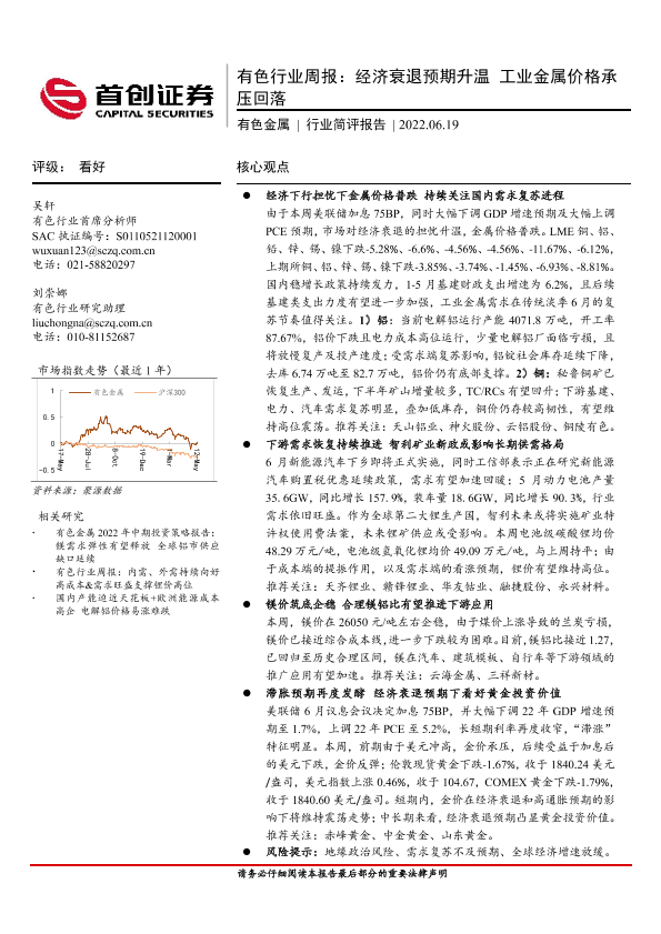 【首创证券】【20220619】20220619-首创证券-有色行业周报:经济衰退预期升温,工业金属价格承压回落-21页