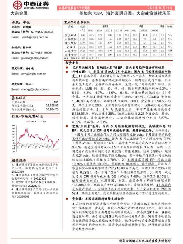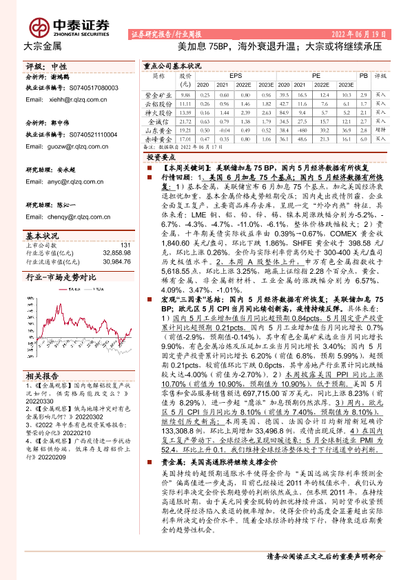 【中泰证券】【20220619】20220619-中泰证券-大宗金属行业周报:美加息75BP,海外衰退升温;大宗或将继续承压-27页