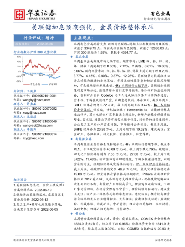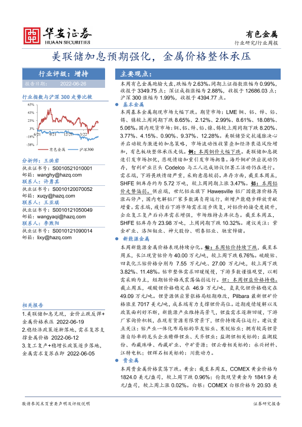 【华安证券】【20220626】20220626-华安证券-有色金属行业周报:美联储加息预期强化,金属价格整体承压-17页