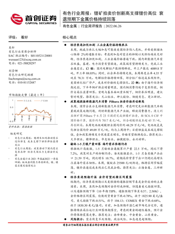 【首创证券】【20220626】20220626-首创证券-有色行业周报:锂矿拍卖价创新高支撑锂价高位 衰退预期下金属价格持续回落-21页