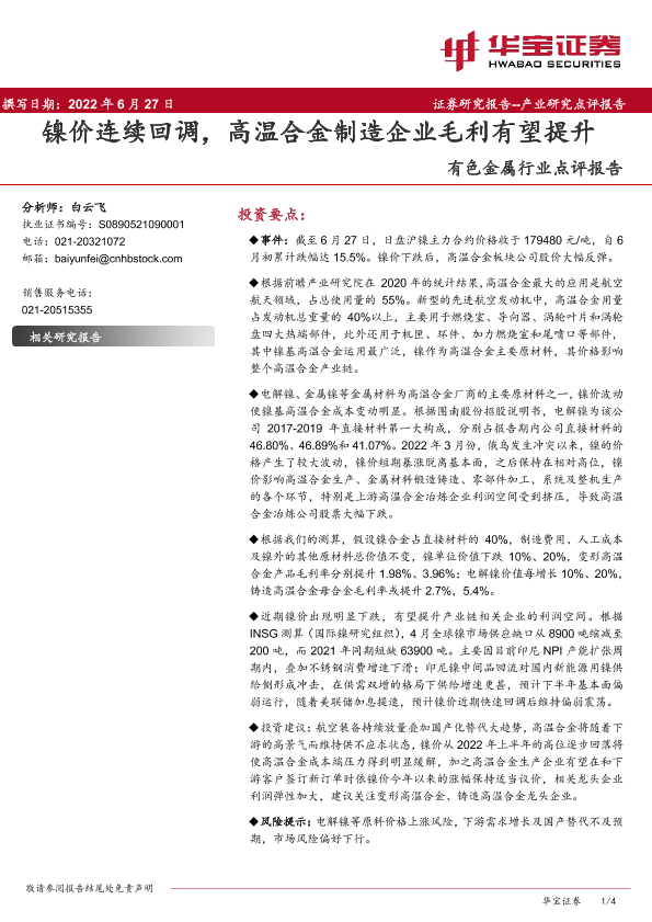 【华宝证券】【20220627】20220627-华宝证券-有色金属行业点评报告:镍价连续回调,高温合金制造企业毛利有望提升-4页