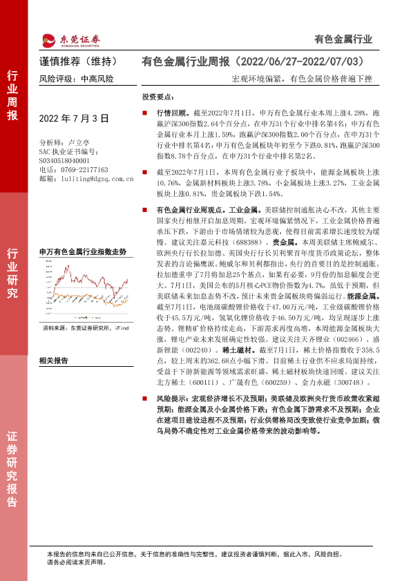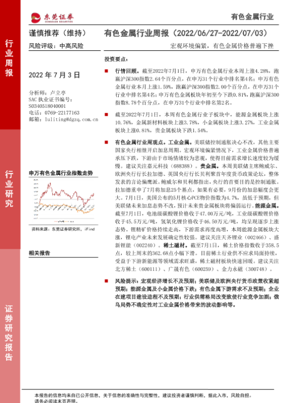 【东莞证券】【20220703】东莞证券-有色金属行业周报:宏观环境偏紧,有色金属价格普遍下挫-11页