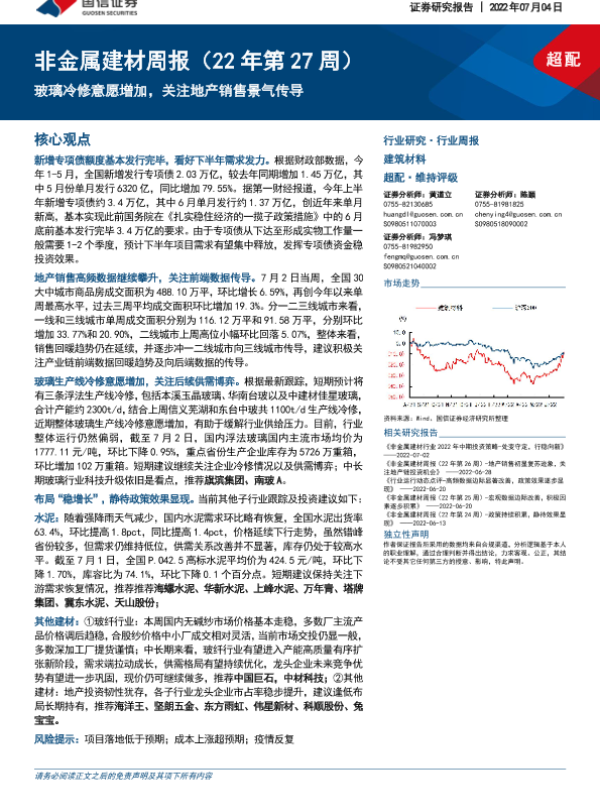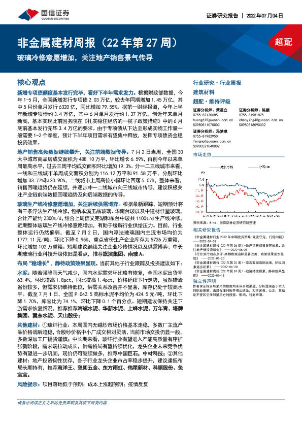【国信证券】【20220704】20220704-国信证券-非金属建材周报(22年第27周):玻璃冷修意愿增加,关注地产销售景气传导-20页