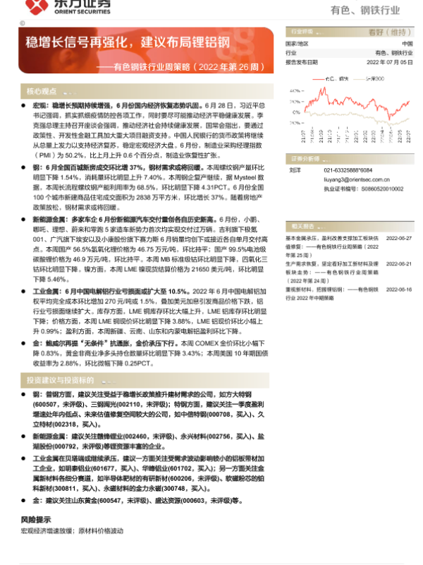 【东方证券】【20220705】2022年第26周有色钢铁行业周策略:稳增长信号再强化,建议布局锂铝钢-37页