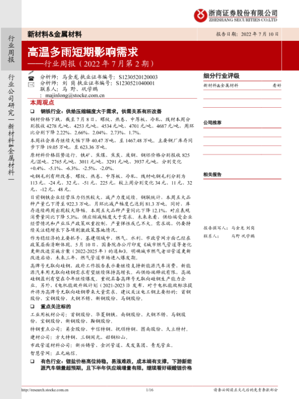 【浙商证券】【20220710】20220710-浙商证券-新材料&金属材料行业周报(2022年7月第2期):高温多雨短期影响需求-16页