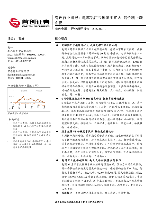 【首创证券】【20220710】20220710-首创证券-有色行业周报:电解铝厂亏损范围扩大铝价料止跌企稳-21页