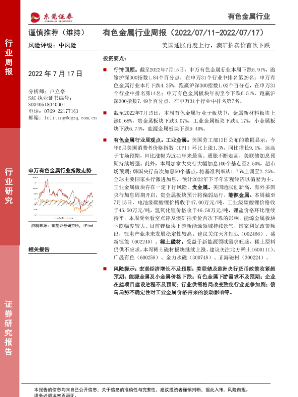 【东莞证券】【20220717】20220717-东莞证券-有色金属行业周报:美国通胀再度上行,澳矿拍卖价首次下跌-11页