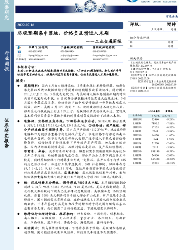 【国泰君安证券】【20220716】悲观预期集中落地,价格负反馈进入末期——工业金属周报-9页