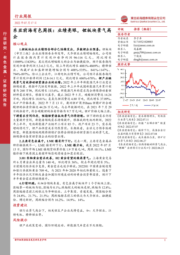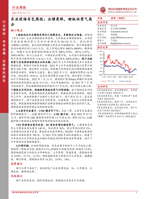 【东亚前海证券】【20220717】东亚前海有色周报:业绩亮眼,锂板块景气高企-20页