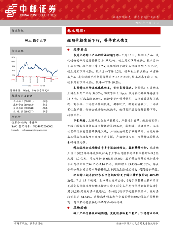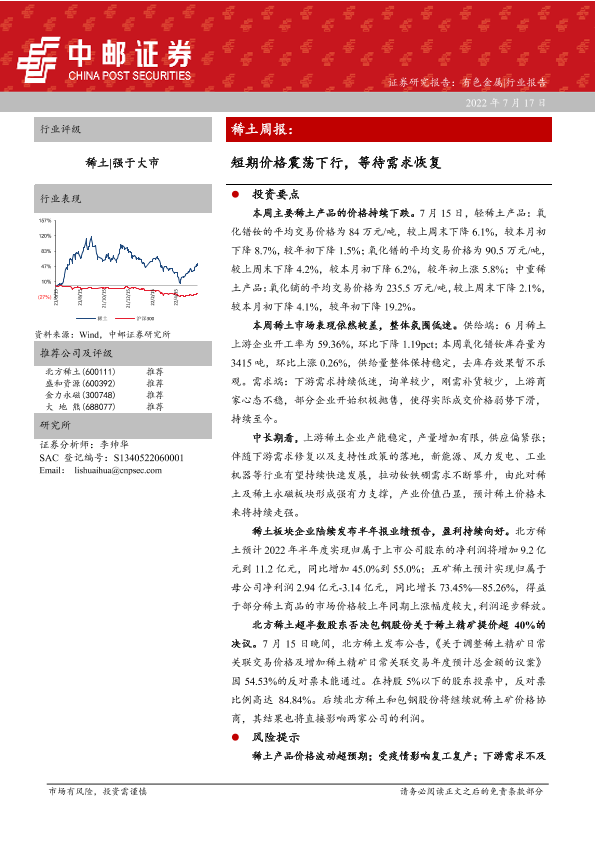 【中邮证券】【20220717】20220717-中邮证券-稀土周报:短期价格震荡下行,等待需求恢复-13页