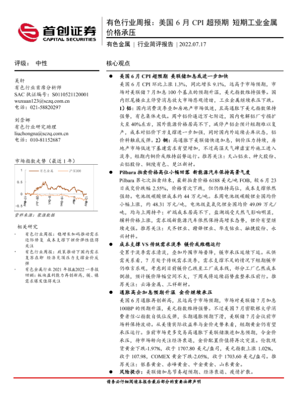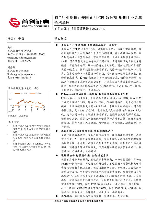 【首创证券】【20220717】20220717-首创证券-有色行业周报:美国6月CPI超预期 短期工业金属价格承压-22页