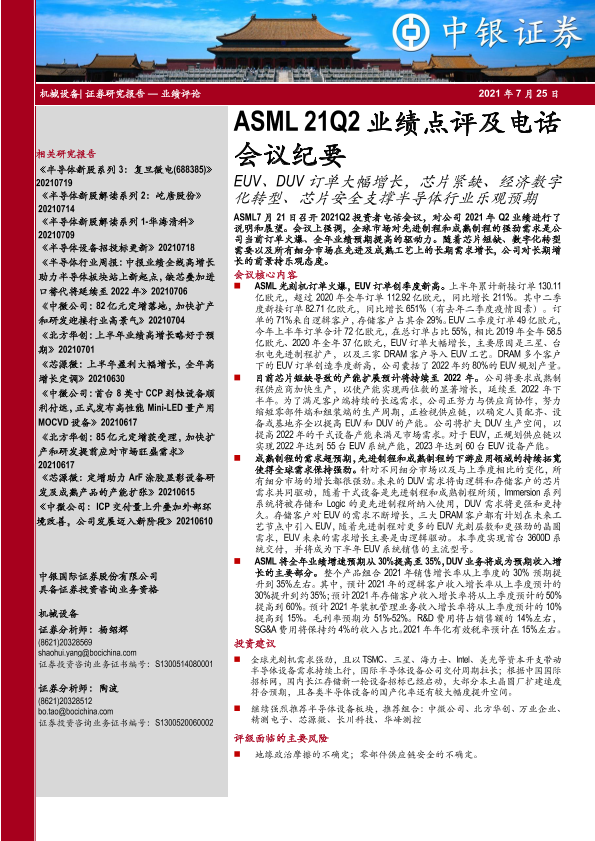 【中银证券】【20210725】21Q2业绩点评及电话会议纪要:EUV、DUV订单大幅增长,芯片紧缺、经济数字化转型、芯片安全支撑半导体行业乐观预期-15页