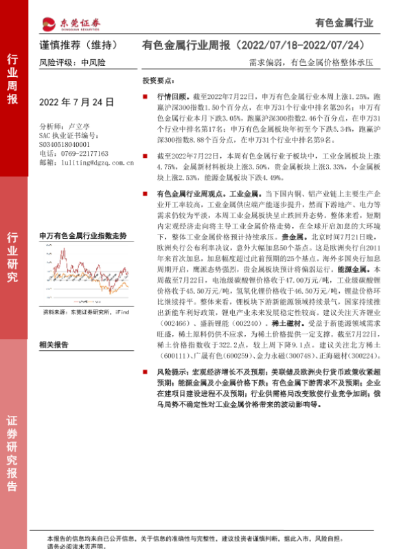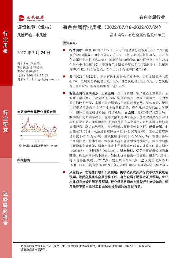 【东莞证券】【20220724】20220724-东莞证券-有色金属行业周报:需求偏弱,有色金属价格整体承压-11页